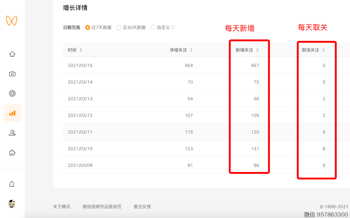 4、查看每天新增、每天取关(可选 最近7天 或 最近30天)
