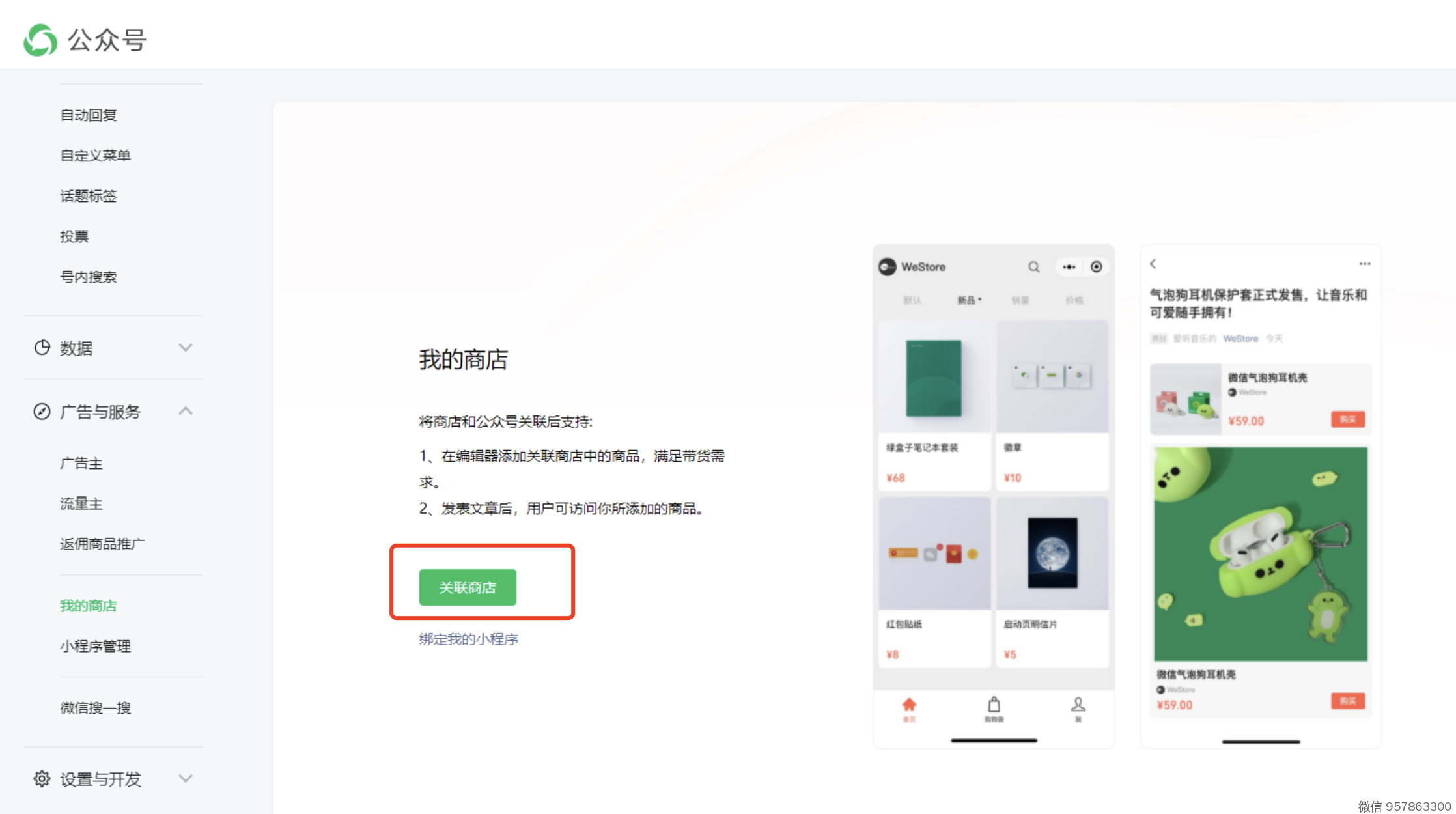 1、去 公众号 设置,开通「我的商品」